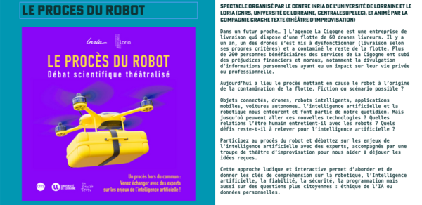 Pour clôturer la journée, les jeunes élèves assisterons à la pièce de théatre d'improvisation "Le procès du robot"(cf. affiche en illustration).